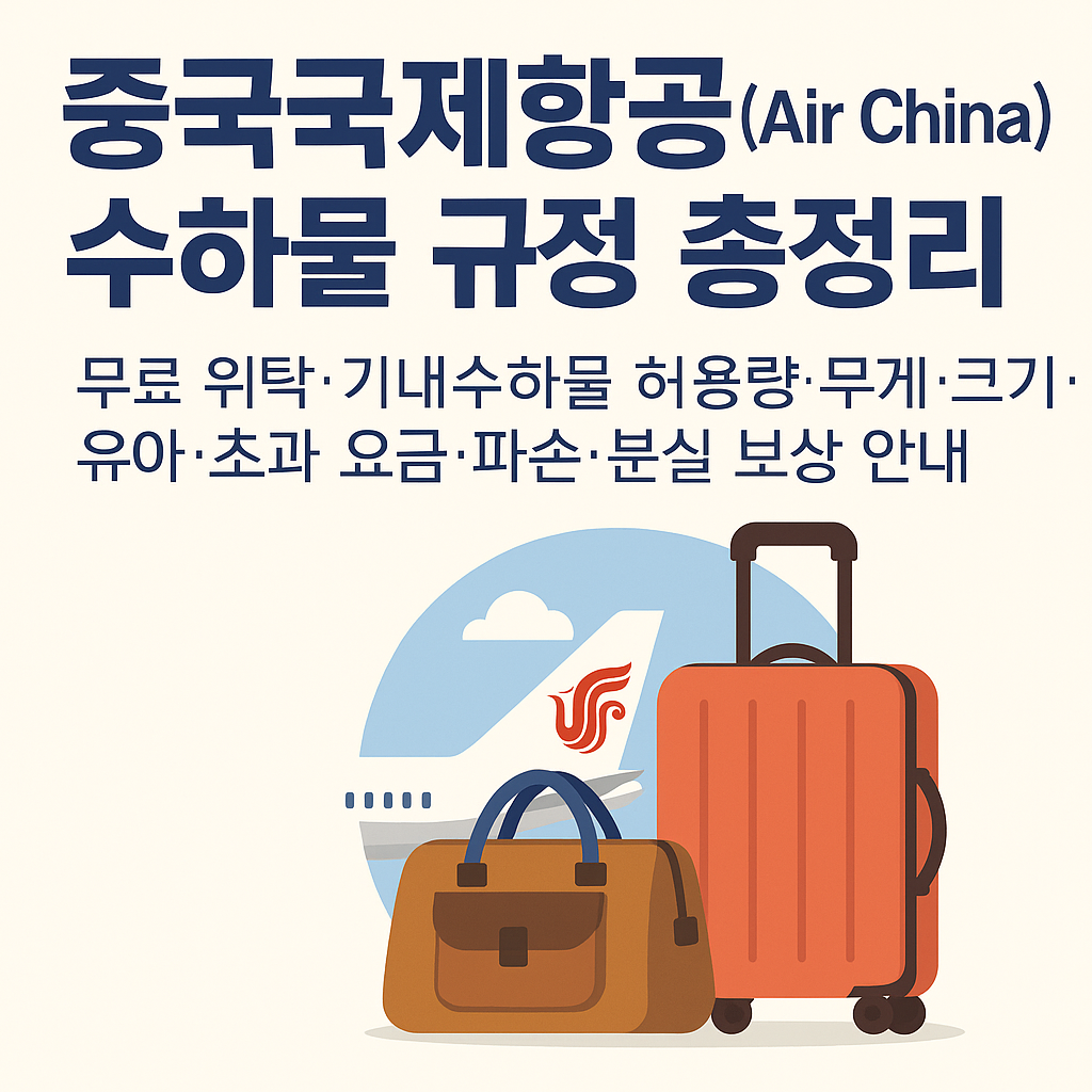 중국국제항공, 에어차이나, Air China, 수하물 규정, 위탁수하물, 무료 수하물, 수하물 허용량, 수하물 무게, 수하물 크기, 삼변 합 158cm, 국제선 수하물, 국내선 수하물, 피스 개념, kg 개념, 퍼스트석 수하물, 비즈니스석 수하물, 이코노미석 수하물, 프리미엄 이코노미 수하물, 유아 수하물, 유모차 규정, 기내수하물, 휴대수하물, 기내 무게 제한, 기내용 가방 크기, 초과수하물, 초과수하물 요금, 특이 노선 규정, 수하물 파손, 수하물 분실, 수하물 보상